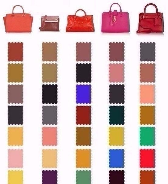 Вот и осень, с каждым днем всё прохладнее. Скоро придется полностью менять сезонные вещи, что-то послужит еще, а что-то надо присмотреть в магазине. Пользуясь таблицей, проще составлять комплекты и делать покупки. Глядя на сочетание цветов, возможно, придут новые идеи использования сочетаний сумочек и обуви. Думаю, по этой же таблице можно подбирать головные уборы, шарфики, перчатки и другие аксессуары.