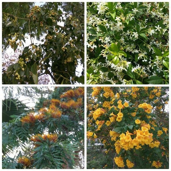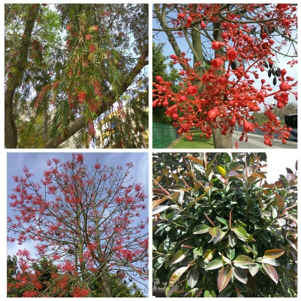 Сегодня обнаружила вот такие цветущие красным цветом деревья и огромный фикус: