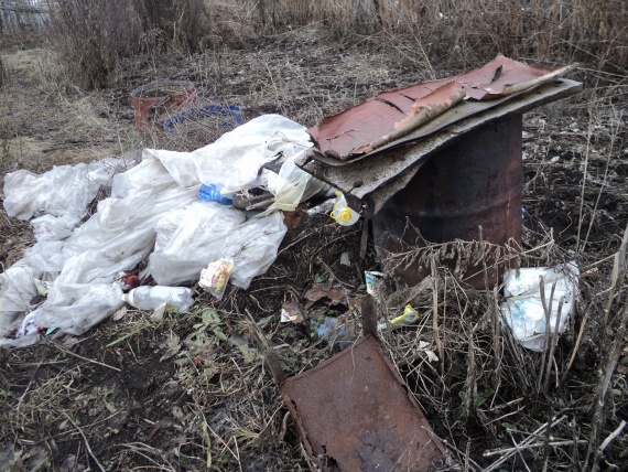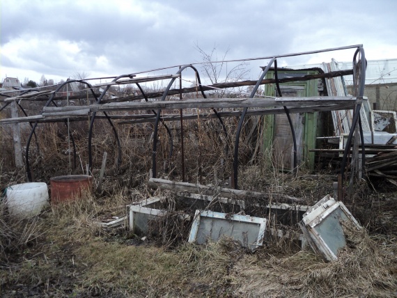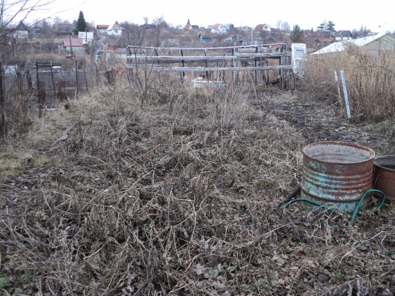 за ручьем несколько совсем брощенных или почти брошенных садов, и я догадываюсь почему — там сыро, низина. Немножко отступая от темы, хочу там по границе участка посадить деревья, пока придумалась только черемуха и ранетка, если будут идеи, буду очень благодарна. Участок к низу покатый, буду делать террасные посадки, очень убедительно Бублик говорит о потере влаги с таких участков. На участке два крана с водой, вода конечно по графику, но вот чего-чего, а бочек там хватает, штук 10 наверное, я не пересчитала. За вот теми теплицами, что на первом фото, есть вот такая куча