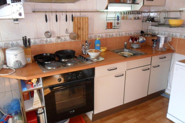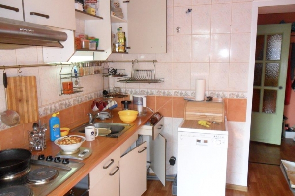 Я уж и на такое не надеялась. Жили мы соседкой, общая кухня, с другими соседями металлическая перегородка. Все запахи, все разговоры и тараканы тоже общие были… Ужас. И наконец соседку отселили!!! Ура!!! Думала я. Наивная. Теперь я сама себе хозяйка, у меня все будет блестеть и сиять, я ЛУЧШАЯ. Но оказалось все совсем не так. Мы поставили перегородку, передвигали стены (кухня стала шире аж на 40 см), соединили душ и туалет. Пока их я не покажу. Мне стыдно. Три года в углу пылилась новая бытовая техника и ждала, когда же мой супруг развернет фантазию и крылья и начнет облагораживать наш быт. А денег то нету. Новую кухонную стенку мне не видать. Но что то надо делать!!! И вот сделал. Вот такая она год назад: