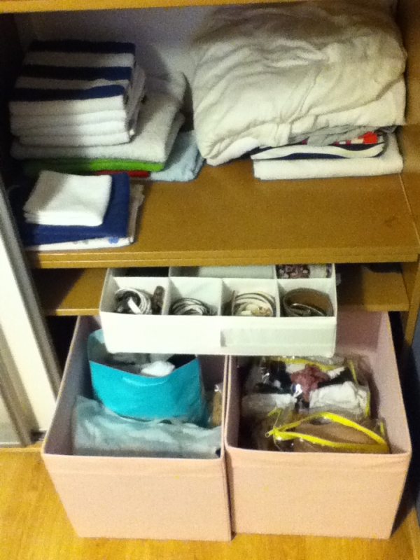 Разложила вещи в шкафу в спальне — в нижним розовых коробах — слева носки и колгкотки, справа — нижнее белье разложено в две прозрачные сумочки. Чуть выше коробочка для хранения поясков, все туда сложила. Вот только не могу простыни на резинке сложить хорошо, они всегда вот таким комом получаются. Поняла еще, что полки и их расположение надо будет поменять — неудобно и как-то места не хватает, просто нерационально использовано оно там.