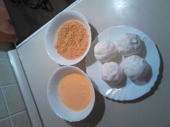 Жарить во фритюре до золотистого цвета. Несколько секунд, или около минуты, зависит от количества и температуры масла. У меня фритюрницы нет, есть маленькая глубокая сковородочка:-) Перевернуть шарик в процессе жарки.