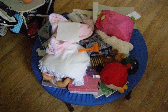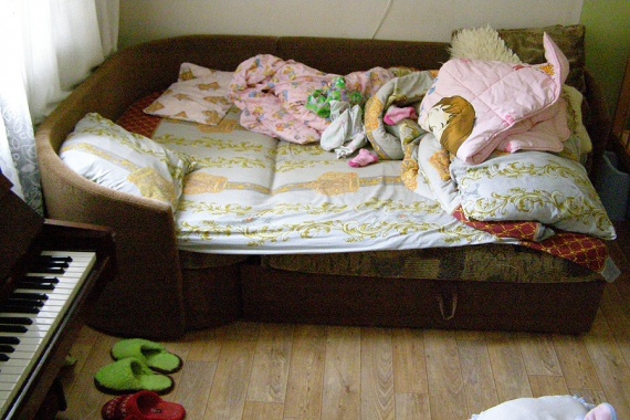 Муж в командировке, ребенок спала со мною, а коробку с игрушками умудрилась высыпать в свою кровать )) И ушла в садик )