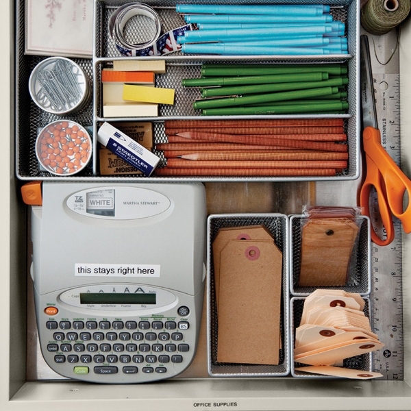 5) Если ваша кухня является центром вашего дома, скорее всего, вы будете постоянно использовать его в качестве второго офиса. Храните все ваши этикетки, канцелярские принадлежности, и другие материалы в ящике. Сетчатые организаторы работают так же хорошо как в кухонном ящике, так и в ящике стола.