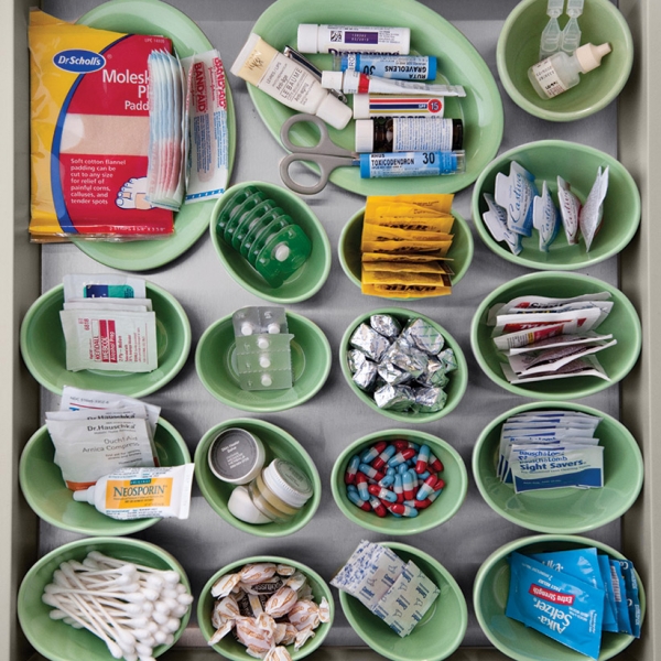 6) Марта любит эти контейнеры нефритового цвета, и она помещает их для эффективного использования в этом ящике. Маленькие блюдца содержат в порядке все элементы медицинской аптечки.