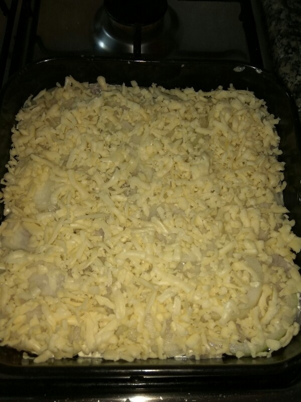 Сверху выложить нарезанный тонкими кольцами репчатый лук и посыпать все натертым сыром(сыра не жалеть, у меня было мало, так что на фотке мало сыра).