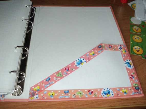 Давно хотела добавить вот такой кармашек на обложку в начале тетрадки, наконец то сделала, сейчас в нем лежат наклейки разные, но потом наверное будут лежать и всякие разные нужные бумажки, записки. Кармашек объемный, туда спокойно можно залезть рукой и там пошарить в поисках нужного )