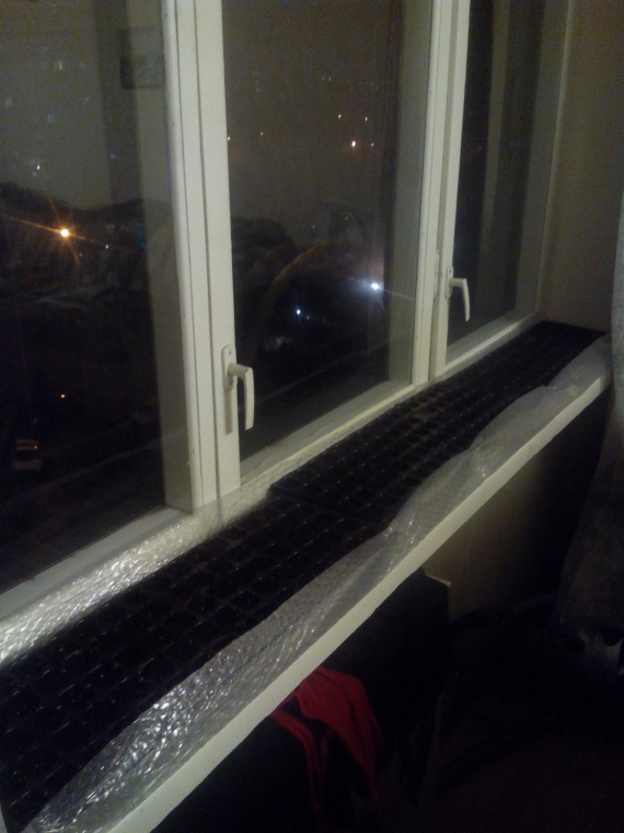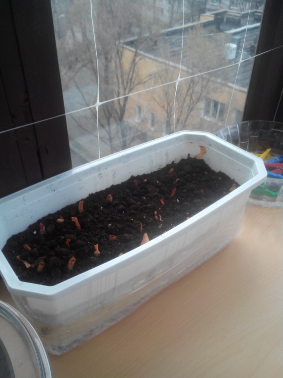 Посадила лук для зелени и муж еще рассаду в формочки рассевает.