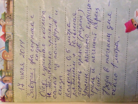 В этот блокнотик мы будем записывать всё, что собираемся съесть и что съедено нами. Включая даже маленький орешек или изюминку. Просто записывайте. Если это кажется Вам несерьезным, открою секрет: за 5 дней подобных записей я потеряла 3 кг. Я ничего больше не делала, ни физических нагрузок, ни диет. Ела, сколько хотела. И просто записывала в блокнот.