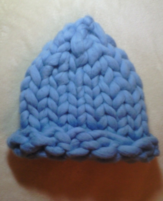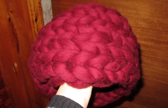 Да, через интернет. По твоей, между прочим, наводке (и, я помню, у тебя тоже была шапочка связана))). Связана, да, поперёк. А потом донышко навязано сверху. Вязала руками. В смысле пальцами.