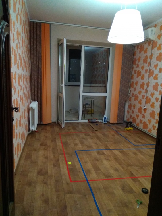 Синей изолентой — границы установленной мебели при размещении, как на последнем варианте.