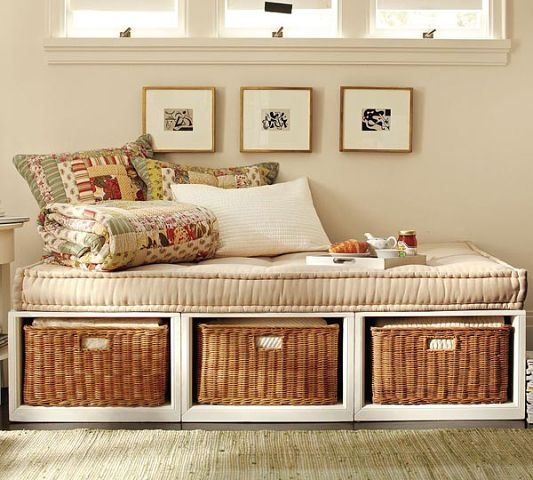 Не понравилась идея с корзинами под кроватью. Вообще против чего бы то ни было под кроватью. Идея с местечком для собаки — сомнительная. Согласна c Vedma. Плетеная мебель у меня на террасе. Со временем между «прутиками» собирается пыль. Спасаюсь пылесосом и средствами по уходу за деревянной мебелью. В принципе, вид не испорчен за 8 лет эксплуатации ни на грамм…