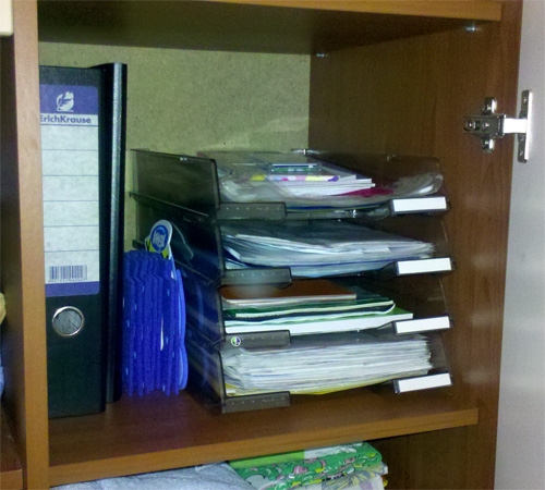 В пустой кубик потом сложила документы. На их разбор ушло много времени. Зато теперь все четко. В большой папке актуальные квитанции, счета, чеки, гарантии, кредиты и пр. с разделителями по категориям. На компе составила список с указанием номеров, чтобы быстро найти нужную бумажку в случае чего. Когда появится КЖ, положу этот список туда :) В лотках архивные документы, которые нельзя выбросить, часто используемые инструкции. В верхнем — пустые файлики, чистые листы, тетради.
