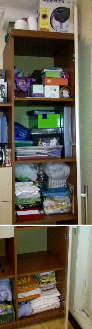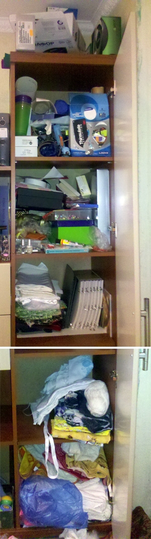 До: верхняя полка — альбомы и хлам, две следующие — неупорядоченные хомячьи запасы, две нижние — белье, полотенца.