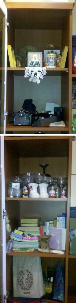 Иконы… тоже все подаренные родственниками. Но отказываться от них как-то не по-божески. Хоть я и не набожный человек. Поэтому, думаю, им теперь в одном углу стало лучше житься, чем расставленным по разным полкам.