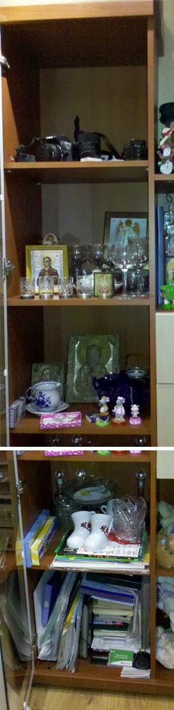 После: верхняя полка выделена для икон. Вторая для фотика. Третья — под посуду, которая не поместилась за иконы. Четвертая — книги, журналы. Пятая — все остальное из других ящиков.