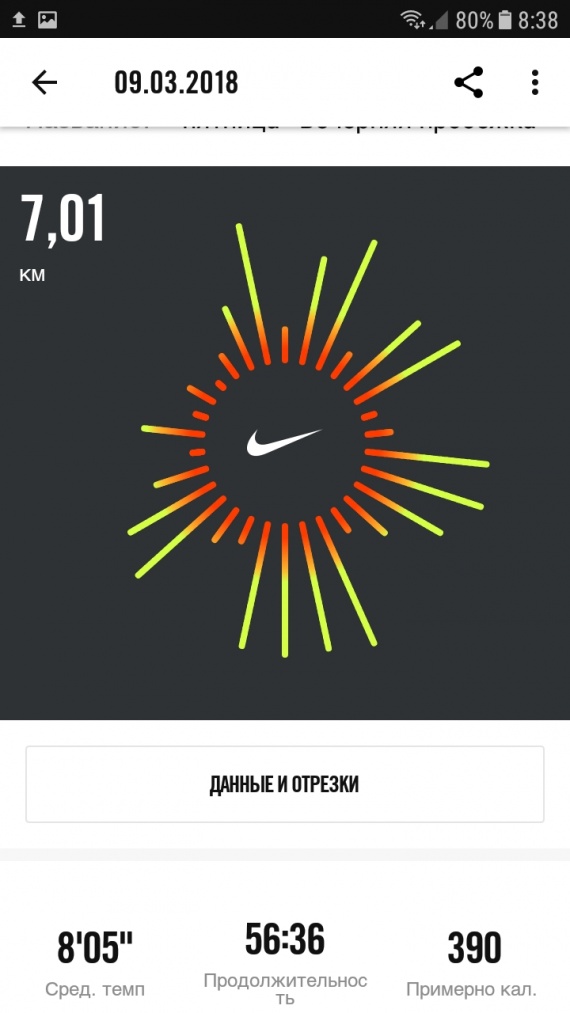 По шагам — 11 200 шагов — и 27 минут медленного бега на низком пульсе.