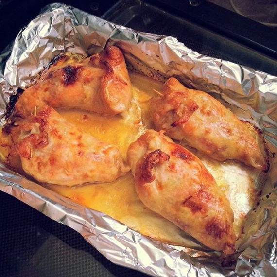Фаршируем наш чулок. Смотрим, чтобы мясо не выползало с тонкого кончика (чулок-чулком, но дырка все равно остается), затем придаем форму окорочка и запечатываем его кожей с бедра, закалывая ее зубочисткой (тут каждый придумывает себе технологию сам, но если я не забуду, сниму видео, как делаю филейку и тогда покажу, как запечатываю я. И да, кужу сверху можно присыпать мелкой солью и сбрызнуть лимоном. А то получается, что начинка внутри соленая, а кожа пресная.